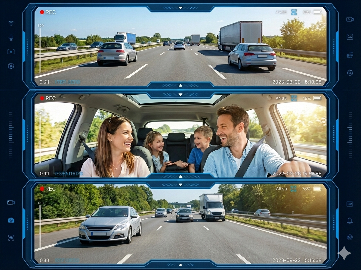 - Przód (170°): Rejestruje każdy szczegół drogi, pasy ruchu i znaki w jakości 1080p.